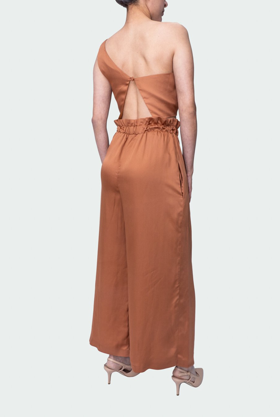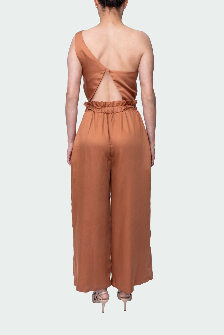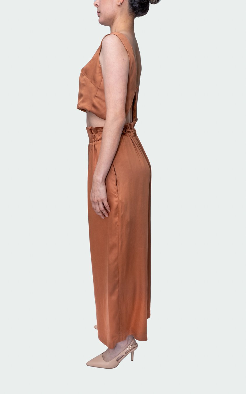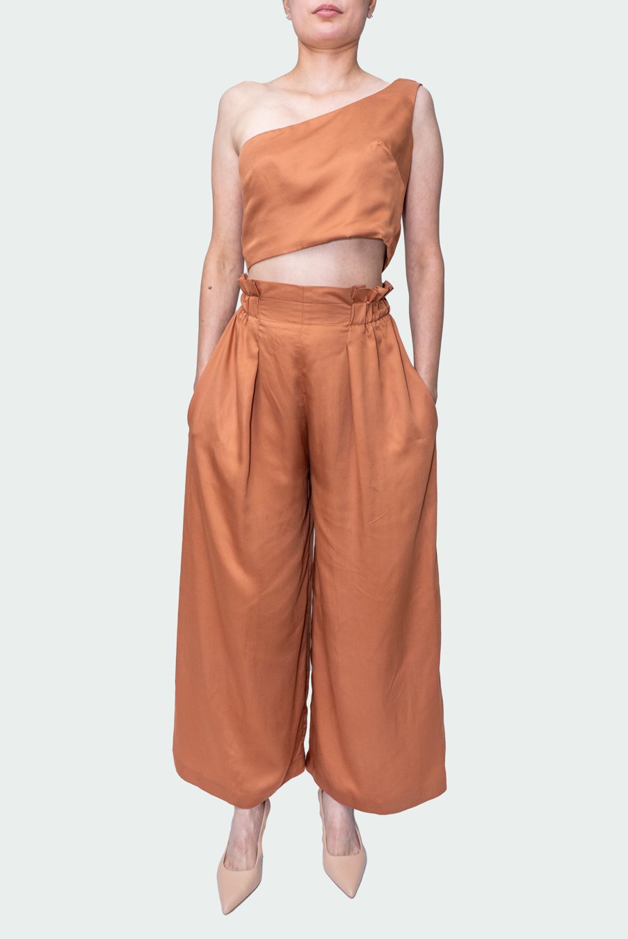 The KIRA Set features a structured, asymmetrical crop top with a bold one-shoulder design and an open back cutout. Paired with high-waisted, wide-leg trousers in a warm rust tone, it creates a silhouette that’s both strong and effortlessly fluid.