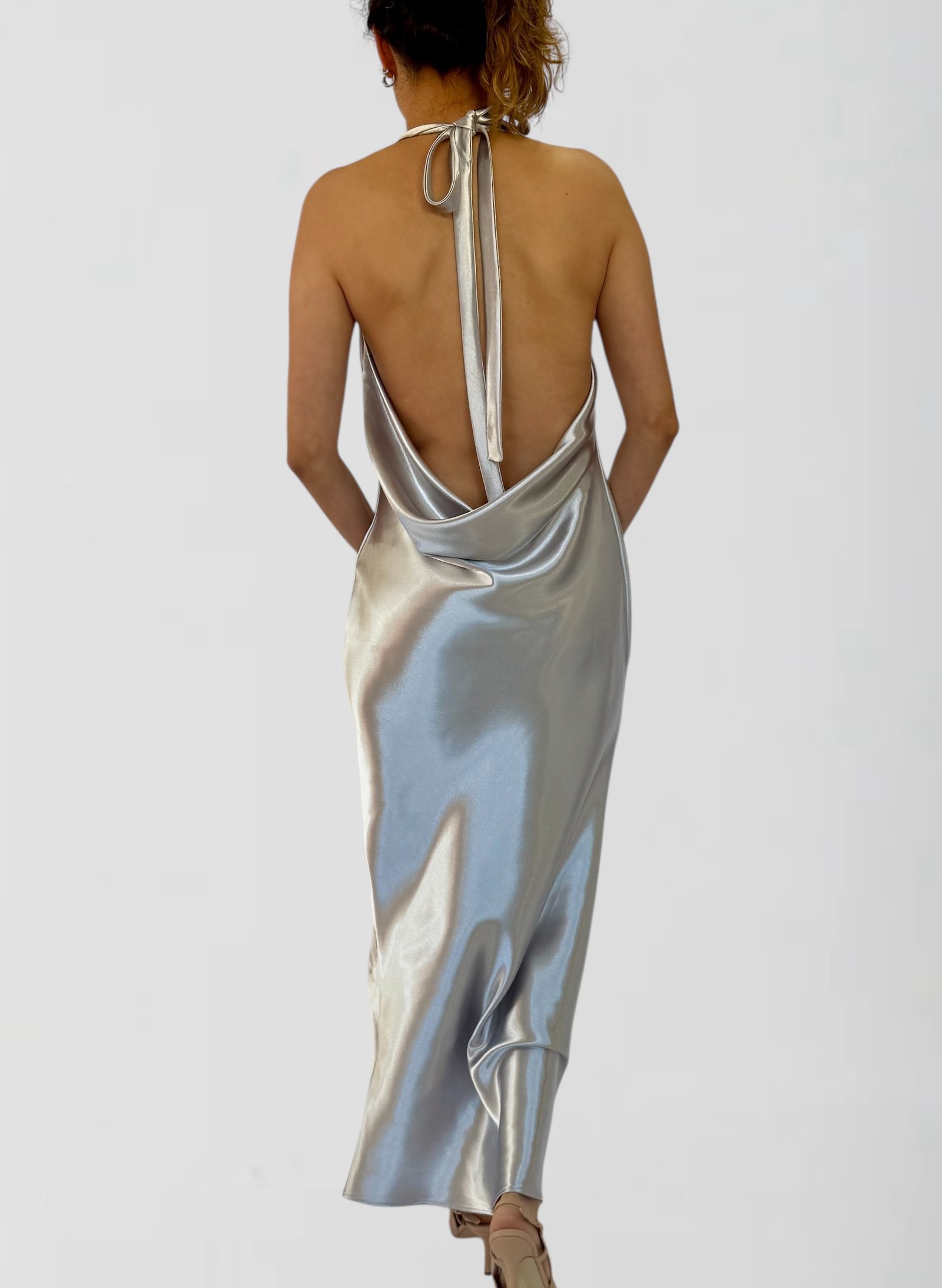 The NOVA Dress liquid silver. A celestial glow, a timeless silhouette. Crafted from lustrous satin with a liquid silver finish that moves like light. Featuring a draped cowl neckline, a daring low back with tie detail, and a fluid bias-cut fit that flatters every curve. Designed to turn heads and capture hearts at every special occasion.